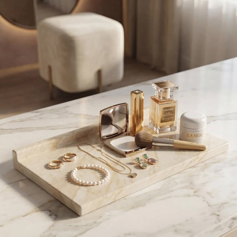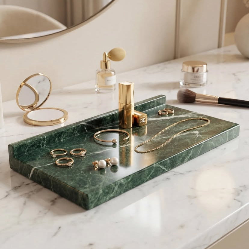 A refined marble vanity tray with a distinctive offset lip, handcrafted to organize jewelry, cosmetics, and everyday essentials. Timeless, functional, and effortlessly elegant.